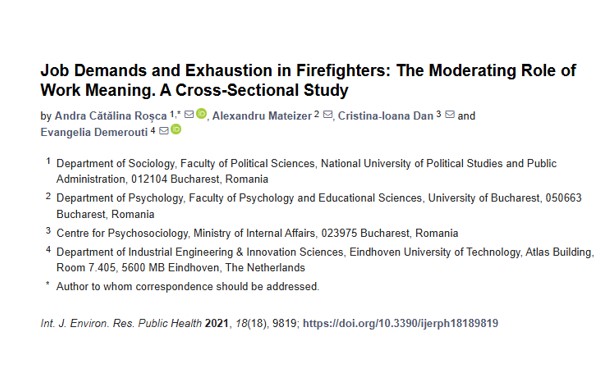 Item Job demands and exhaustion in firefighters : the moderating role of work meaning : a cross-sectional study(MDPI, 2021) Roșca, Andra Cătălina; Mateizer, Alexandru; Dan, Cristina IoanaEmotional exhaustion and other symptoms of burnout are often found among emergency services professions, such as firefighting. Given the social importance of this activity and the high responsibility it requires, prevention and alleviation of burnout symptoms become primary concerns in ensuring the well-being of firefighters. Although work meaning is one of the factors associated with a lower risk of developing burnout, its protective role has not been studied in firefighters. Therefore, the purpose of this study was to assess the buffering role of work meaning in the health-impairment process of the Job Demands-Resources model, targeting the relationship between job demands and related emotional exhaustion. A cross-sectional survey design was used to collect data from a sample consisting of Romanian firefighters (n = 1096). Structural equation modeling indicated a positive link between job demands and exhaustion. In addition, deriving personal meaning from work was associated with lower levels of exhaustion in firefighters. A small but significant interaction effect between work meaning and job demands showed that higher levels of work meaning attenuated the positive relationship between job demands and exhaustion. In conclusion, our findings suggest that work meaning has a buffering effect on the impact of various job demands on job-related exhaustion. Nevertheless, the small effect sizes warrant further research on this topic.Item The dark triad traits of firefighters and risk-taking at work : the mediating role of altruism, honesty and courage(MDPI, 2021) Roșca, Andra Cătălina; Burtăverde, Vlad; Dan, Cristina IoanaFirefighting is considered a dangerous profession that imposes unique safety hazards. In this research, we investigated the relationship between the Dark Triad traits of firefighters (N = 1434, Mage = 39.03, SD = 6.9) and their risk-taking at work, considering the mediation role of altruism, honesty, and courage. We showed that firefighters high on Machiavellianism and psychopathy reported high risk-taking. Altruism, honesty, and courage mediated the relationship between Machiavellianism and risk-taking in firefighters. Honesty and courage mediated the association between psychopathy and risk-taking. Theoretical and practical implications are discussed.