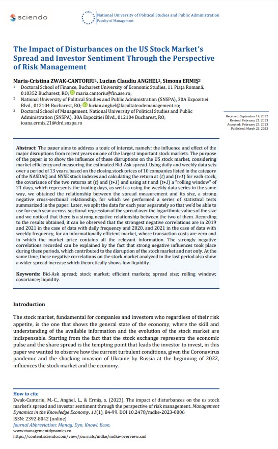 Item The Impact of" Black Swan" Events on Oil and the European Capital Markets(Academic of Economics Studies, 2024) Anghel, Lucian Claudiu; Zwak-Cantoriu, Maria Cristina; Obreja, Carmen; Afjal, MohdThe price of oil and, indirectly, the performance of the stock indexes were significantly impacted by the evolution of the energy market in the context of the switch to renewable energy sources and the modifications in global energy policy. This paper proposes a comprehensive analysis of several crucial financial field elements, with particular attention to the evolution of stock indices, financial market volatility, and investor response to major events that have recently caused changes in the global economy. Using advanced economic and statistical models, the paper shows the complex relationship between the analysed stock indices, the trends and changes that occurred within them and the relevant influencing factors, such as the price of oil and the Baltic Dry Index.The results of the DCC-GARCH models highlight a significant positive correlation between the stock indices of several European countries, underlining the interconnection of these markets in conditions of increased volatility.Item Volatility analysis and cryptocurrency interconnections(Scientific Research Publishing (SCIRP), 2024-04) Zwak Cantoriu, Maria Cristina; Anghel, Lucian ClaudiuThe main purpose of this paper is to investigate the volatility in the cryptocurrency market and the relationships between them, using the cryptocurrencies: Bitcoin, Cardano and Stellar. The results obtained suggest that volatility in cryptocurrency prices is influenced by previous events and the level of past volatility. The propagation of volatility and shocks between the three analyzed cryptocurrencies, and the observation of the interconnection between them was also followed in this paper. By determining the degree of correlation between the analyzed cryptocurrencies, we observed that in the selected period there are quite strong positive correlations. Also, we noticed that the volatility of cryptocurrencies was strongly influenced by certain economically uncertain periods, a fact that caused their prices to have a strong fluctuation, especially in the period 2021-2023. The results obtained show an interdependence between the three cryptocurrencies, which is significant in the decision-making of investors. News and events play a significant role in the cryptocurrency market, especially those in the financial, technological, and political worlds that can have a considerable impact on cryptocurrency prices and volatility. In the case of Bitcoin, there was an increase in interest in this cryptocurrency when there were investments from large companies and financial institutions.Item Analysing sustainability based relationship between debt and growth in South-Asian economies and their impact on textile industry: a case for developing economies(2022) Gillani, Durdana Qaiser; Birau, Ramona; Naeem, Muhhamad Zahid; Anghel, Lucian Claudiu; Spulbar, Cristi; Ninulescu, Petre Valeriu; Spulbar, Andrei Cristian; Ejaz, AbdullahThis research aims to quantify the linear and non-linear relationship between debt and economic growth in selected developing economies. Based on theoretical arguments and annual data considerations in modelling the debt and growth as a complex relationship across countries, our panel methodology is based on the fixed effect technique. Our core finding indicates that government debt lowers the GDP in selected developing economies. We also find that the urban population is a key factor that improves economic growth. Moreover, government expenditures on health and industrialization are helpful to enhance the growth of the economies. Our study also suggests increased exports, industrial development, and investment in education for growth. We also propose certain supporting strategies to reduce the adverse effects of debt-growth relation in the considered economies. Given developing economies’ status, the prerequisite for broad, dynamic and rule-based debt policy is of paramount importance, ensuring the factual choices among numerous possibilities, addressing financial constraints and ensuring intergenerational welfare impact.Item Exploring the intersection of professional social networks and competitiveness : a systematic review and bibliometric analysis(The Bucharest University of Economic Studies, 2025-07) Becheş, Petrică Dumitru; Mititean, Pompei; Anghel, Lucian Claudiu; Catrina, Maria ManuelaThis study explores how professional social networks affect competitiveness using a bibliometric approach. The study uses data from the Web of Science database from 1998 to 2024 and a selection of 165 scholarly publications. The selection was made according to PRISMA guidelines for systematic literature review in 2020, while data analysis was done using Bibliometrix R package. The objective was to identify major research areas, spot new topics of interest, and chart the conceptual platform for this area by looking for co-citation, co-occurences from keywords, and thematic clusters. Early findings show how professional social networks help improve competitiveness by facilitating knowledge sharing, driving innovation diffusion, and generating strategic linkages. The clusters found were grouped into four broad categories: motor themes, basic themes, emerging themes, and niche themes, each described according to how they contribute to forming competitive advantage. This original comprehensive systematic review, to our knowledge, explores how professional social networks intersects with competitiveness, providing a sound groundwork for future studies.Item The development of the Romanian art market(Hyperion University, 2024-05) Gheorghiu, AndaThe Romanian art market occupies a relatively modest place in the international context, but it has registered a significant growth in the last decades, attracting more and more attention on the global stage. Like 