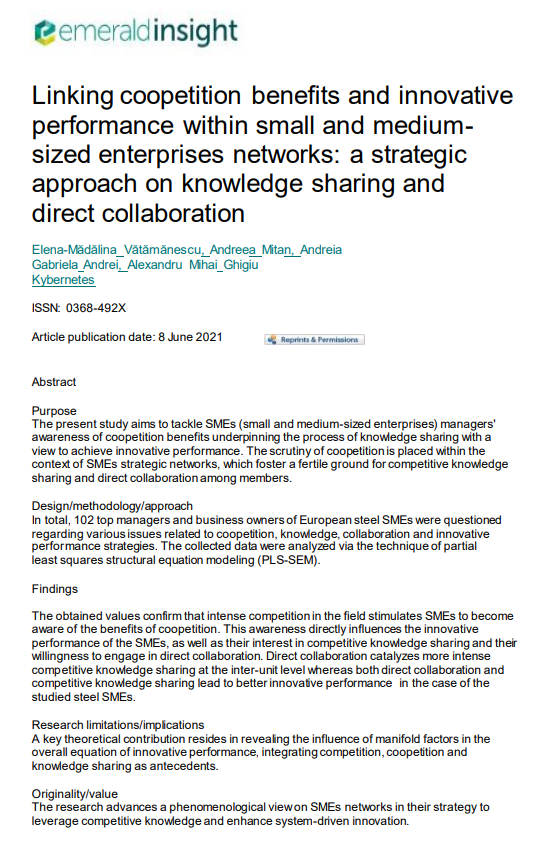 | dc.description.abstract | Purpose The present study aims to tackle SMEs (small and medium-sized enterprises) managers' awareness of coopetition benefits underpinning the process of knowledge sharing with a view to achieve innovative performance. The scrutiny of coopetition is placed within the context of SMEs strategic networks, which foster a fertile ground for competitive knowledge sharing and direct collaboration among members. Design/methodology/approach In total, 102 top managers and business owners of European steel SMEs were questioned regarding various issues related to coopetition, knowledge, collaboration and innovative performance strategies. The collected data were analyzed via the technique of partial least squares structural equation modeling (PLS-SEM). Findings The obtained values confirm that intense competition in the field stimulates SMEs to become aware of the benefits of coopetition. This awareness directly influences the innovative performance of the SMEs, as well as their interest in competitive knowledge sharing and their willingness to engage in direct collaboration. Direct collaboration catalyzes more intense competitive knowledge sharing at the inter-unit level whereas both direct collaboration and competitive knowledge sharing lead to better innovative performance in the case of the studied steel SMEs. Research limitations/implications A key theoretical contribution resides in revealing the influence of manifold factors in the overall equation of innovative performance, integrating competition, coopetition and knowledge sharing as antecedents. Originality/value The research advances a phenomenological view on SMEs networks in their strategy to leverage competitive knowledge and enhance system-driven innovation. | |